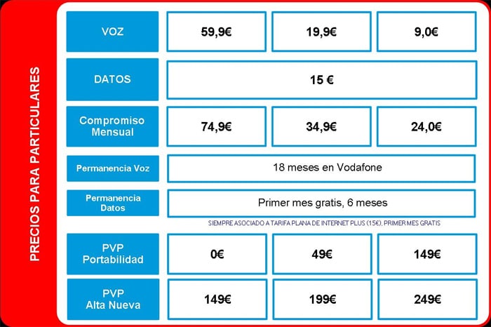 Los precios del HTC Legend para particulares varían en función de su procedencia (alta nueva o portabilidad), tarifa de voz y tarifa de datos y varían entre 0€ y 249€. La tabla con todos los precios se puede ver en la imagen a continuación. Los clientes actuales de la compañía tendrán la oportunidad de canjear sus puntos por el terminal también (279€ + 1000 puntos, por ejemplo).
